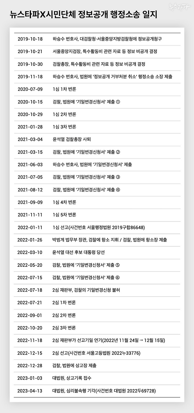 뉴스타파와 ‘세금도둑잡아라’ 등 3곳의 시민단체는 검찰을 상대로 행정소송을 진행했고 3년 5개월 만인 지난 13일, 특수활동비, 특정업무경비, 업무추진비의 세부 집행내역과 지출 증빙자료의 최종 공개 판결을 받아냈다. 지난 17일에는 검찰에 내용증명을 보내 대법원이 확정 판결한 대로 예산 자료의 공개를 조속히 이행할 것을 촉구했다.