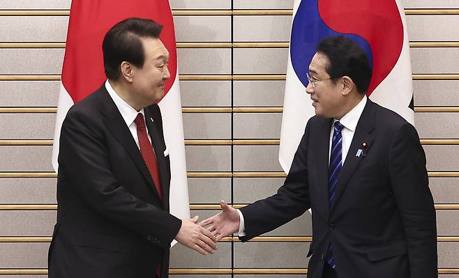 | ▲ 1박2일 일정으로 일본을 방문한 윤석열 대통령이 16일 오후 일본 도쿄 총리 관저에서 기시다 후미오 일본 총리와 한일 확대정상회담에 앞서 악수하고 있다. 2023.3.16 |
