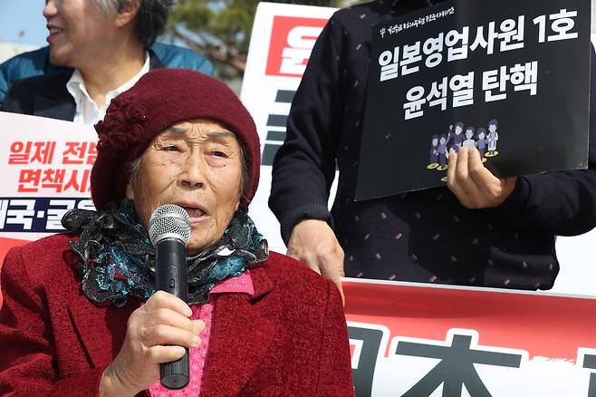 | ▲ "우리나라 대통령인지 외국 대통령인지" 21일 오전 광주시청 평화의 소녀상 앞에서 열린 '한일 정상회담 규탄' 기자회견에서 일제 강제동원 피해자 양금덕 할머니가 발언하고 있다. 양 할머니는 "나는 솔직히 대통령이 우리나라 대통령인지 외국 대통령인지 감을 못 잡겠다"고 말했다. 2023.3.21 |