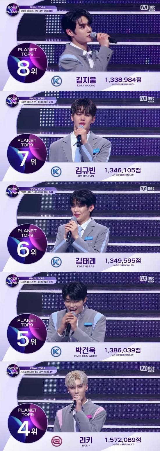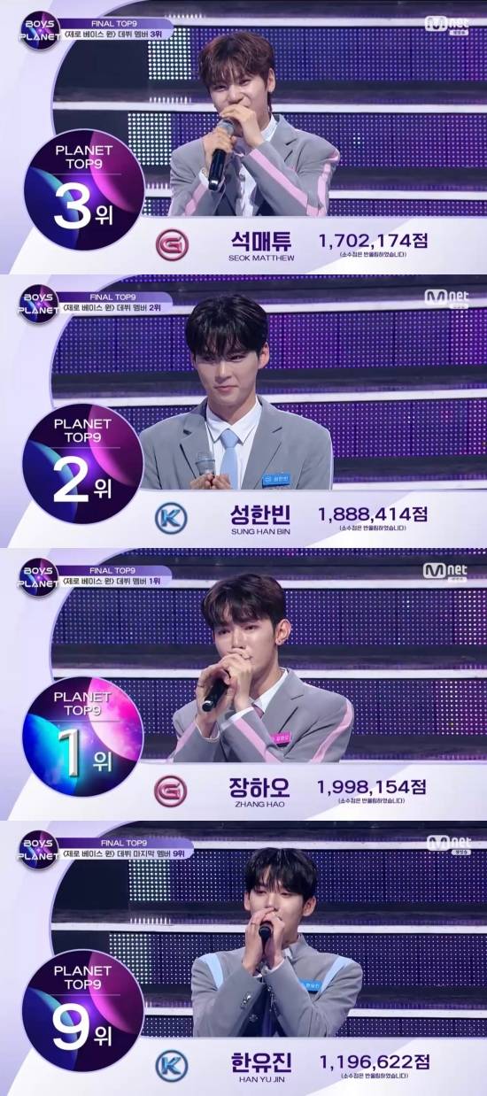 한편 데뷔조 TOP 9명으로는 8위 김지웅, 7위 김규빈, 6위 김태래, 5위 박건욱, 4위 리키, 3위 석매튜, 2위 성한빈, 마지막으로 9위는 한유진이 이름을 올렸다.