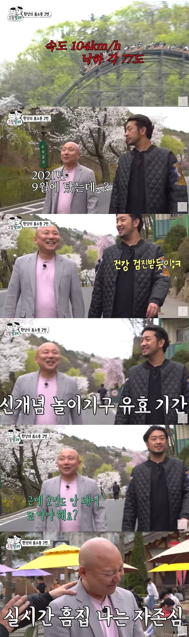 이날 이말년과 주호민은 놀이동산을 찾았다. 대표적인 놀이기구인 티익스프레스 앞에선 둘은 "끝 없이 있는데 나중에는 죽여줘" "한 번도 탄 적이 없어"라고 대화했다.