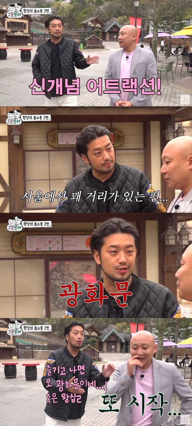 그는 "용인이 수도권이지만 거리가 있지 않냐. 놀이기구를 정신 없이 타고 내리면 광화문인 거다 어떠냐"라며 대중 교통까지 한 번에 해결하는 방법을 제안했다. 하지만 주호민은 어이 없다는 반응으로 외면했다.