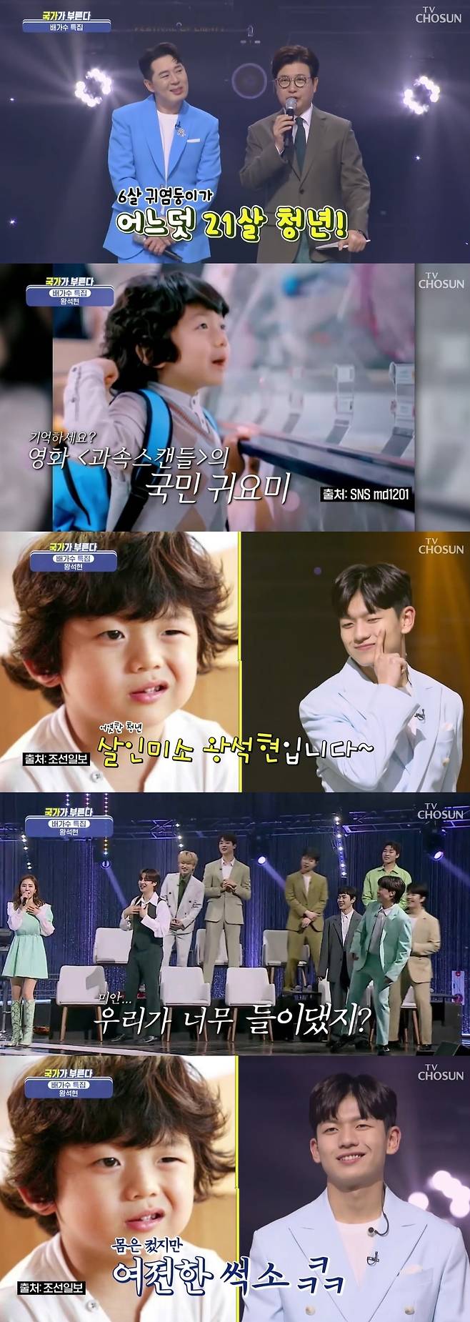 이날 MC들은 "6살이라는 나이에 썩소 하나로 전국 이모, 삼촌 마음을 사로잡은 주인공. 어느덧 21살이다"라며 왕석현을 소개했다.