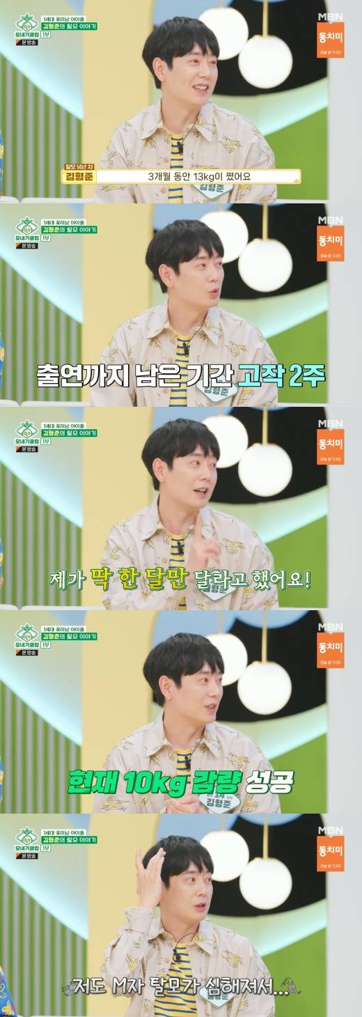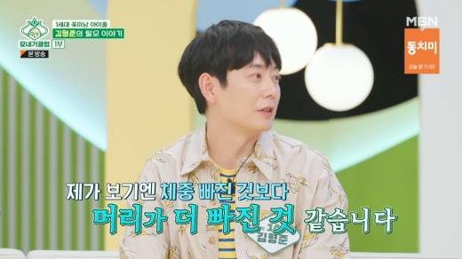 그러자 김형준은 “내가 보기엔 체중 빠진 것보다 머리가 더 빠진 것 같다. 나도 M자 탈모가 심해져서 고민이 많다”라고 고백했다.