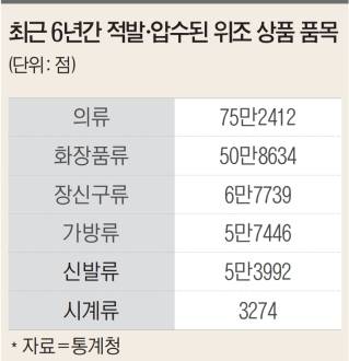 놀라운 점은 가품 화장품의 비중이다. 최근 6년 간 가장 많은 짝퉁 품목은 의류(75만2412점)에 이어 화장품류(50만8634점)였다. 가방류(5만7446점) 보다 월등하게 많았다.