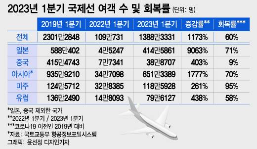 24일 국토교통부 항공정보포털시스템에 따르면 올해 1분기 국제선 여객 수는 1388만3331명을 기록했다. 지난해 동기(109만731명)보다 1172.8% 급증한 수치다. 코로나 이전(2301만명)과 비교할 경우 국제선 여객 회복률은 약 60%다. 동계 성수기가 포함된 1분기에 일본과 동남아 여행 수요가 되살아난 덕분이다. 올해 1분기 일본을 오간 여객 수는 총 414만5861명으로 전체의 30%다. 일본 여객 회복률은 70%에 달한다. 일본과 중국을 제외한 베트남·인도·필리핀·태국 등의 아시아 국가도 회복률이 70%를 나타냈다.
