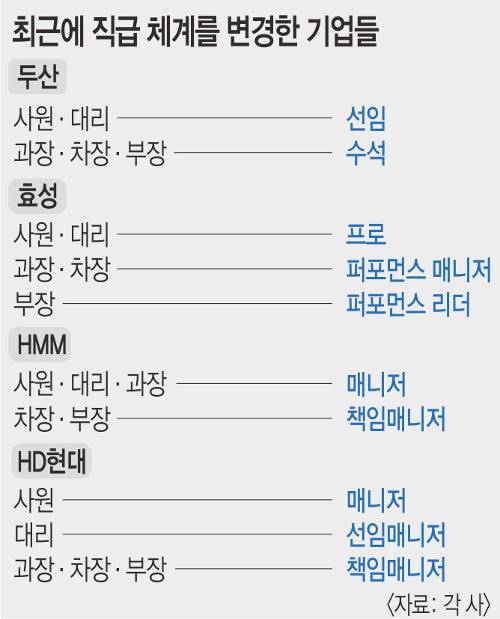 24일 업계에 따르면 두산그룹은 지난달 21일부터 기존 5단계였던 직원 직급을 2단계로 줄였다. 과장·차장·부장은 수석으로, 사원·대리는 선임으로 직급을 통합했다. 효성은 이달부터 사원과 대리를 프로 직급으로 합쳤다. 과장과 차장은 퍼포먼스 매니저(PM), 부장은 퍼포먼스 리더(PL)로 바꿨다. 해운사인 HMM과 팬오션도 올해부터 직급을 각각 2단계, 4단계로 축소했다. HMM은 책임매니저, 매니저로 단순화했고 팬오션은 7단계(사원~실장)로 구분하던 직급을 4단계(사원·주임·선임·책임)로 줄였다.