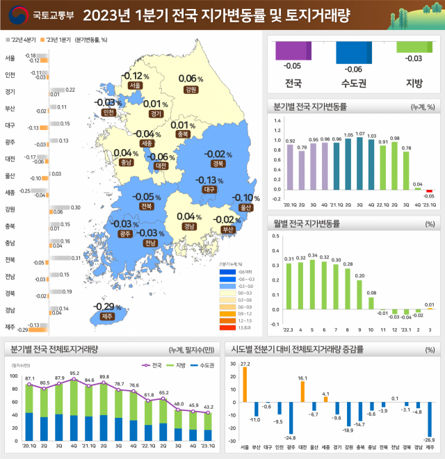국토교통부와 한국부동산원은 올해 1분기 전국 지가가 0.05% 하락한 것으로 집계됐다고 25일 밝혔다.