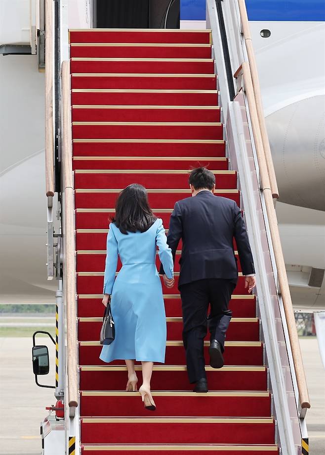| ▲ 미국을 국빈 방문하는 윤석열 대통령과 김건희 여사가 24일 성남 서울공항에서 공군 1호기에 탑승하고 있다. |