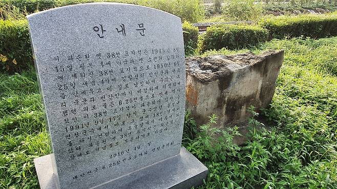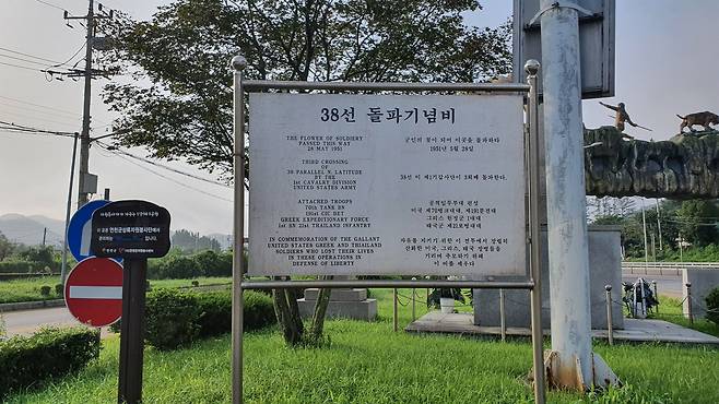 오래도록 보존하여 보여줄 것은 옛 38선 표지이고 안내문은 보조적인 것인데 안내문 표지를 너무 가까이 세운 탓에 사진에 담기도 불편하다. 안내표지가 옛 표지석보다 너무 멀끔해서 첫 시선은 그쪽으로 끌려간다. 주객이 바뀐 느낌이다.