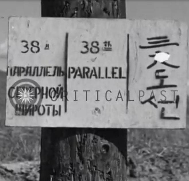 | ▲ 한국어와 영어, 러시아어로 각각 쓰여져 있는 38선 표지.(출처 미확인) |