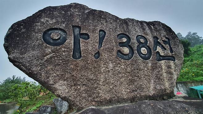 북위 38도임을 표시한 첫 번째 실물 표지는 이곳에서 멀지 않은 연천군 백학면 통구리 453-1(청정로 188번지)에 있다. 371번 도로의 길가라서 찾기 쉽다. 커다란 자연석에 '아! 38선'란 문구를 큼직한 글씨로 음각한 것이다. 자동차를 타고 통구리 동쪽으로 가면서 GPS로 38도 지점을 더 찾아봤다. 파주군 적성면 어유지리 황우마을 앞길도 38도였다. 조금 더 동쪽으로 진행해서 파주군 전곡읍 양원리의 어느 골프장 근처, 밋밋한 고개에서도 38도를 확인할 수 있었다.