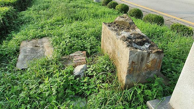 38선돌파기념비 옆 철로 가까이에는 큼직한 자연석으로 세운 38선 표지가 있다. 그 앞에는 반들반들한 화강암으로 만든 안내표지가 있다. 그런데 안내문이 설명하고 있는 것은 큼직한 38선 표지가 아니고 그 바로 옆에 있는 깨지고 낡은 콘크리트 설치물이다. 상단은 잘라진 채 땅바닥에 놓여 있고 기단은 제자리에 박혀있다. 안내문이 그 내력을 알려주고 있다.