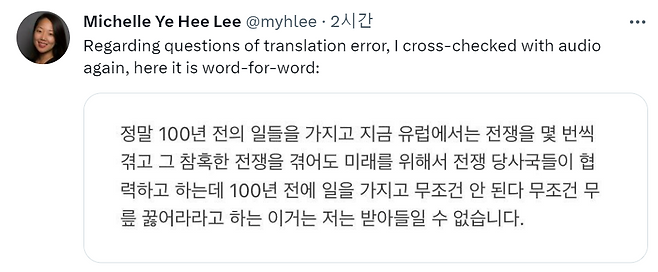 논란이 일자, 윤 대통령을 인터뷰한 <워싱턴포스트> 미셸 예희 리 기자는 오늘 오전 자신의 SNS에 "오역 논란과 관련해 인터뷰 녹음을 다시 확인했다"며 대통령 발언한 녹취록 원문을 공개했습니다. 한국어로 된 윤 대통령의 발언을 그대로 올린 겁니다.