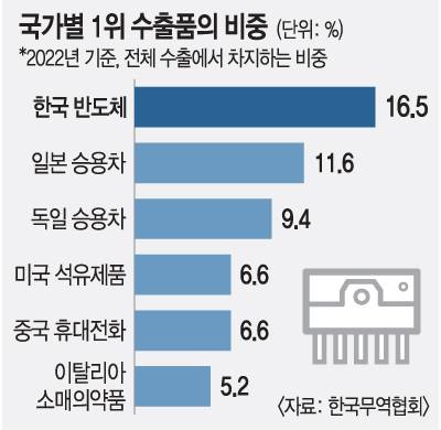 한국 수출의 ‘1위 수출품 쏠림’은 세계 최고 수준이다. 무협은 한국의 1위 품목(반도체)이 전체 수출에서 차지하는 비중이 지난해 기준으로 16.5%라고 밝혔다. 일본 승용차(11.6%), 중국 휴대전화(6.6%), 독일 승용차(9.4%) 등과 비교해 압도적이다.