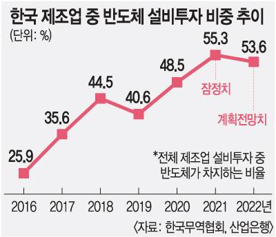 또한 반도체와 다른 산업의 수출 격차가 커졌다. 2016년부터 7년간 한국 반도체 수출 증가분이 전체 수출 증가분에서 차지하는 비중은 42.3%에 이르렀다. 같은 기간에 반도체 외 품목의 수출 증가율은 2% 수준에 머물렀다. 한국 제조업의 설비 투자 가운데 반도체 비중도 2016년 25.9%에서 지난해 53.6%까지 치솟았다. 정 부회장은 “좋게 보면 반도체 투자를 많이 한 것이지만, 거꾸로 보면 반도체 이외 산업은 사실상 투자를 포기해 왔던 것”이라고 꼬집었다.