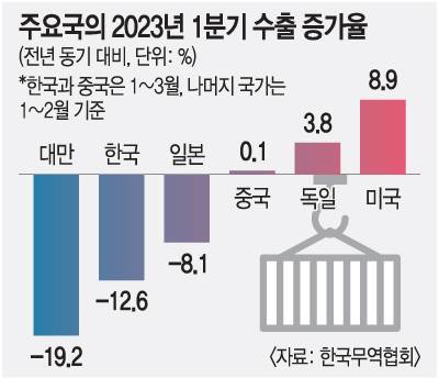 주요 수출국 가운데 한국과 대만이 ‘반도체 한파’의 된서리를 맞았다. 올해 1분기 기준으로 한국과 대만의 수출 증가율은 전년 동기 대비 각각 12.6%, 19.2% 급감했다. 한국 수출의 핵심인 중간재 수출 규모는 전년 대비 19.5% 줄었다. 한국의 대(對)중국 수출은 29.8%, 반도체 수출은 40% 감소한 것으로 집계됐다.
