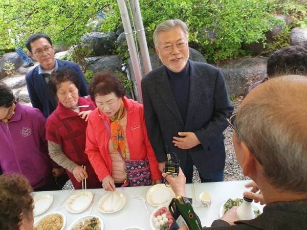 문 전 대통령 부부는 행사 마지막에는 주민과 기념촬영도 했다. 이날 비가 내리는 궂은 날인데도 지지자 등 주민 30여 명이 책방을 찾아 “대통령님, 여사님 사랑합니다”고 외치자 문 전 대통령 부부가 손을 흔들며 답례했다.