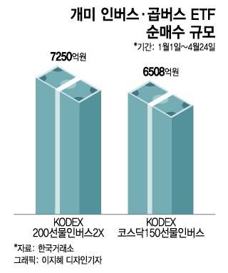 한국거래소에 따르면 올해 들어 개인은 'KODEX 200선물인버스2X' ETF를 7250억원 순매수했다. 국내 ETF 중 개인의 순매수 규모가 가장 컸다. 'KODEX 코스닥150선물인버스' ETF는 6508억원 사들였다. 두 상품은 전체 종목 순위에서도 수급이 몰린 POSCO홀딩스, 에코프로, 에코프로비엠 등 2차전지 관련주에 이어 4, 5위에 올랐다.