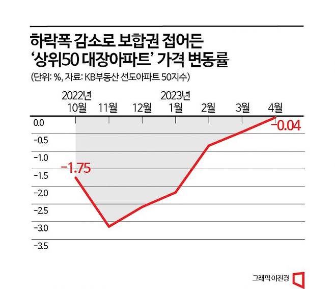 거래량과 가격 회복세를 보이는 건 이 단지 뿐만이 아니다. 강남권에 위치한 이른바 ‘대장 아파트’ 가격 하락폭이 눈에 띄게 둔화되고 있다. 이날 KB국민은행이 발표한 월간주택동향에 따르면 이달 ‘KB선도아파트50’ 지수는 전달 대비 0.04% 하락했다. 이는 전달(-0.45%)보다 0.41%포인트 감소한 수치로 사실상 보합권 진입을 눈앞에 둔 수치다. 이 지수는 지난해 11월 3.14% 하락하며 역대 최대 낙폭을 기록했지만 이후 5개월 연속 하락폭이 급격히 둔화되고 있다.