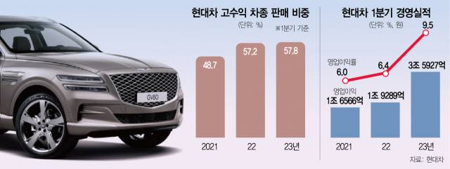현대차는 생산 차질을 최소화하며 1분기 글로벌 판매량을 지난해 대비 13% 늘리는 데 성공했다. 특히 제네시스와 스포츠유틸리티차량(SUV) 등 ‘비싼 차종’의 판매 확대에 집중하며 수익성을 끌어올렸다. 현대차의 1분기 전체 판매에서 제네시스와 SUV가 차지하는 비중은 57.8%다. 올해 들어 팔린 차 10대 중 6대를 차지한 셈이다. 2년 전인 2021년까지만 해도 이 비중은 48%에 머물렀다.
