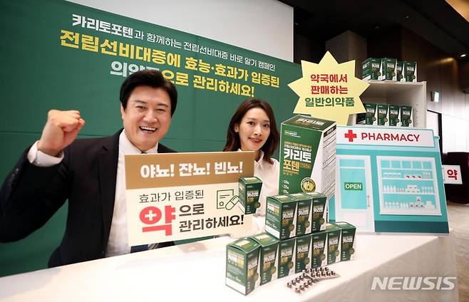 [서울=뉴시스] 조성봉 기자 = 26일 오전 서울 중구 더플라자호텔에서 모델들이 전립선비대증 관리의 필요성을 알리는 '카리토포텐과 함께하는 전립선비대증 바로 알기 캠페인'을 소개하고 있다. 동국제약은 전립선비대증 개선제인 카리토포텐이 약국에서 구입할 수 있는 입증된 일반의약품이라는 것을 알리기 위해 이번 행사를 마련했다. 2023.04.26. suncho21@newsis.com