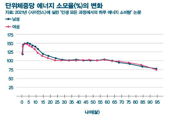 2021년 과학저널 <사이언스>에 ‘인생의 모든 과정에서의 하루 에너지 소비량’(Daily energy expenditure through the human life course)이라는 제목의 흥미로운 논문 한 편이 실렸습니다. 논문에 이름이 실린 저자만 무려 90여 명에 이르는 대규모 연구로, 전세계 29개국에서 살아가는 총 6421명의 생후 8일 된 아기부터 95살 노인까지 전 연령대 사람들의 에너지 소비량을 비교분석한 연구였습니다. 조사 대상에서 남성과 여성의 비율은 4 대 6 정도였고요. 사람은 일생 중 언제 에너지를 가장 많이 소모할까요?