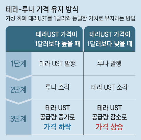 가상화폐인 테라가 화폐처럼 쓰이려면 테라 가격이 안정적이어야 한다. 테라의 가격 안정을 위한 보조 수단으로 쌍둥이 화폐 루나가 등장했다. 테라(UST)는 개당 가격이 1달러에 연동되는 화폐였고, 테라폼랩스는 루나를 이용해 테라의 가격을 1달러에 맞췄다. 테라 가격이 1달러 아래로 떨어지면 회사는 루나를 발행해 시장의 테라를 사들여 테라 가격을 높였다. 반대로 테라 수요가 늘어 테라 가격이 1달러를 넘어가면 회사가 테라를 추가로 발행해 공급 물량을 늘렸고, 여기서 얻은 주조차익 일부로 루나 유통량을 조절했다. 중앙은행이 국채와 단기 금융상품 등을 통해 시장에 개입하는 것처럼 루나를 활용해 화폐 메커니즘에 개입하는 방식이다. 권도형 대표는 “테라를 맡기면 20% 이자를 주겠다”는 가상화폐 예금 상품(앵커 프로토콜)도 출시했다. 하지만 이 구조는 테라의 지속적인 수요가 뒷받침되고, 신규 테라 사용자가 계속 늘어나야만 가능한 구조였다. 검찰은 “실제 테라가 결제 수단으로 사용되지 않아 수요가 적었고, 신규 투자자가 없으면 뒷받침되지 않았던 예금 상품”이라며 “전형적 다단계 사기”라고 판단했다.