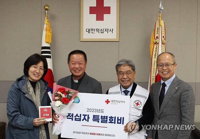 (수원=연합뉴스) 26일 경기도 수원시 대한적십자사 경기도지사에서 성공회 강화읍 성당 김대술 암브로스 사제의 특별회비 전달식이 열리고 있다. 10여 년 동안 수원역 일대에서 노숙인을 도와 '노숙인의 대부'로 불리는 김 신부는 시인으로도 활동하고 있으며 최근 시집 '그 먼 어느 젊은 별에게'를 출간했다. 그는 이날 독자 후원금 200만원을 적십자 특별회비로 기탁했다. 2023.2.26 [대한적십자사 경기도지사 제공. 재판매 및 DB 금지]
