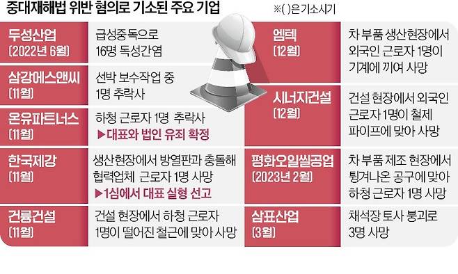 중대재해로 CEO가 연거푸 처벌받게 되면서 기업들의 우려는 한층 커질 전망이다. 대검찰청에 따르면 중대재해법이 시행된 지난해 1월 27일부터 올해 3월 말까지 중대재해법 위반으로 기소한 14건 모두 대표나 그룹 총수가 경영책임자로 지목돼 재판에 넘겨졌다. 특히 지난달 말 정도원 삼표그룹 회장이 계열사인 삼표산업의 채석장 붕괴 사고에 대해 중대재해법 위반 혐의로 재판에 넘겨지면서 그룹 총수도 계열사 사고로 실형을 선고받을지 모른다는 불안감이 커지고 있다.