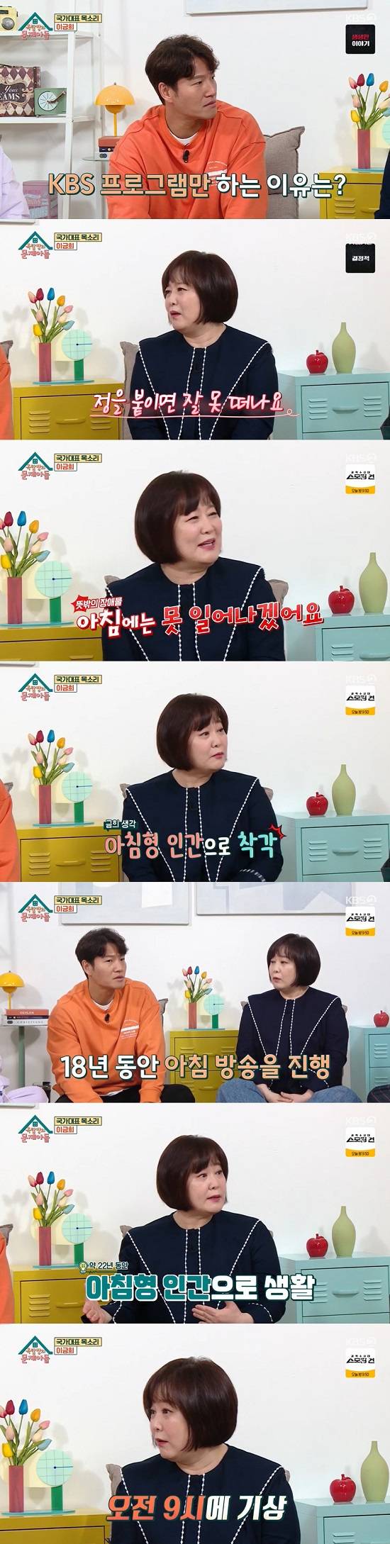 이날 김종국은 이금희에게 "프리랜서를 선언한 지 꽤 되지 않았냐. 왜 KBS 프로그램만 하냐"고 질문했다. 이에 이금희는 "제가 정을 붙이면 잘 못 떠난다"며 "그래서 저와 제일 친한 방송작가 언니가 1990년도부터 같이 해 33년 째 일을 하고 있다"고 답했다.
