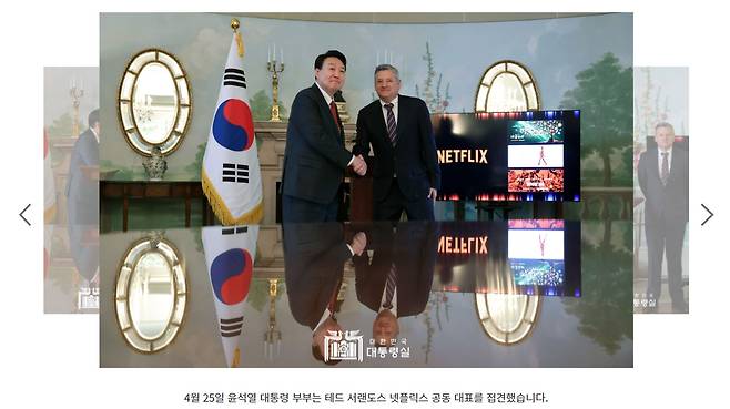 | ▲ 4월 25일 윤석열 대통령이 테드 서랜도스 넷플릭스 공동 대표를 접견할 당시 모습을 촬영한 대통령실 사진. 테이블에 비친 윤 대통령의 얼굴이 대통령실 워터마크에 가려져 있다(왼쪽). |
