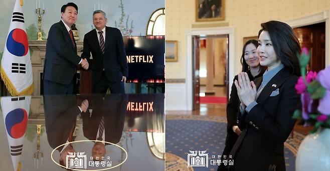 | ▲ 4월 25일 윤석열 대통령이 테드 서랜도스 넷플릭스 공동 대표를 접견할 당시 모습을 촬영한 대통령실 사진. 테이블에 비친 윤 대통령의 얼굴이 대통령실 워터마크에 가려져 있다(왼쪽). 같은날 김건희 여사가 '백악관 친교행사'에서 질 바이든 여사에게 선물을 주고 있는 대통령살 사진(오른쪽). |