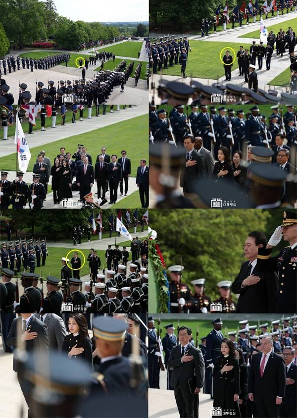 | ▲ 대통령실 홈페이지에 게시된 윤석열 대통령 부부의 알링턴 국립묘지 헌화 사진. 노란색 동그라미 안이 윤석열 대통령. |