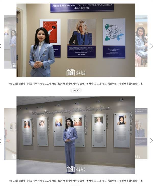 김 여사의 '미 국립 어린이병원 특별후원 기념행사 참석' 사진뉴스 중에는 여행 독사진처럼 보이는 컷이 2장 올라왔다. 매체의 취재 접근이 용이하지 않은 현장의 특성을 감안했을 때, 대통령실은 영부인이 어떻게 민간과 교류를 하고 있는지 촬영해 보여주는 게 더 합당하다는 평가가 가능하다.