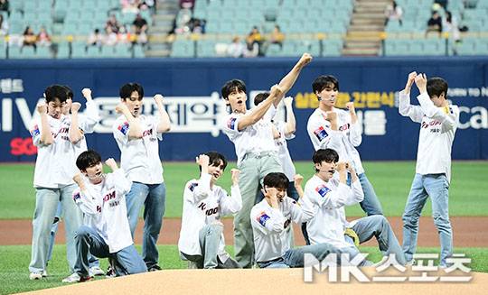 경기에 앞서 보이그룹 오메가엑스가 그라운드에서 축하공연을 펼치고 있다.