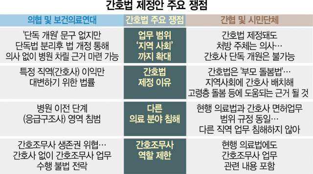 간호법 1조의 ‘지역사회’ 문구를 둘러싼 혼란도 계속될 것으로 보인다. 간호법 1조는 ‘모든 국민이 의료기관과 지역사회에서 수준 높은 간호 혜택을 받는다’고 규정하고 있다. 대한의사협회 등은 간호법 제정 이후 시행령 등 하위 법령 개정 또는 추가적인 법 개정을 통해 ‘단독 개원’의 길이 열릴 것으로 보고 있다. 간호법 제정은 고령화 시대 돌봄 사업의 주도권을 간호사가 갖기 위한 포석이라는 게 의협의 주장이다. 의료계의 한 관계자는 “제정에 비하면 개정은 쉽다”며 “의료법에서 간호법을 떼어내고 나면 다시 개정을 시도할 것”이라고 내다봤다.
