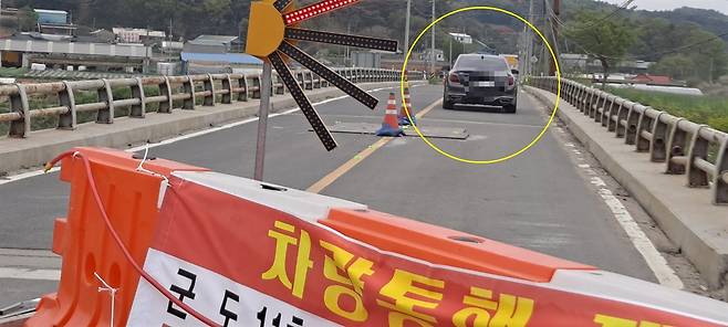 | ▲ 충남 홍성군 전면 통제되고 있는 와룡교를 무단 통행하고 있는 승용차. |
