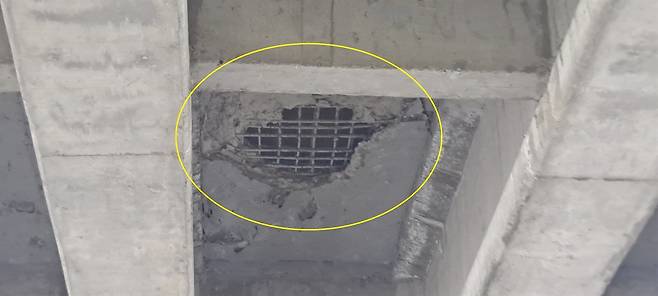 | ▲ 와룡교 포트홀 하단부는 구멍히 뻥 뚤린 상태다. 철골 구조물이 앙상하게 그 모습을 드러내고 있다. |