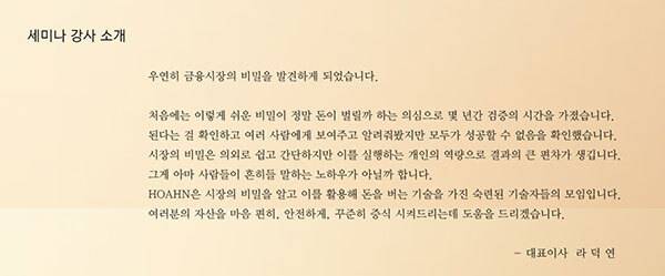 이날 세미나 주제는 ‘돈으로 돈을 버는 자산주’였는데, 이는 최근 사건이 터진 뒤 사건 관련자들이 언론에 밝힌 투자개념과 유사하다. 라씨 일당에 30억원을 투자했다는 가수 임창정씨는 “이들은 저평가된 우량기업에 대한 가치 투자를 통해 재력 있고 신망 있는 유명한 자산가의 주식계좌를 일임받아 재테크 관리를 하고 있다고 했다”고 했다. 주가조작 세력이 본인들을 ‘가치투자자’라고 불렀다는 전언도 있다.