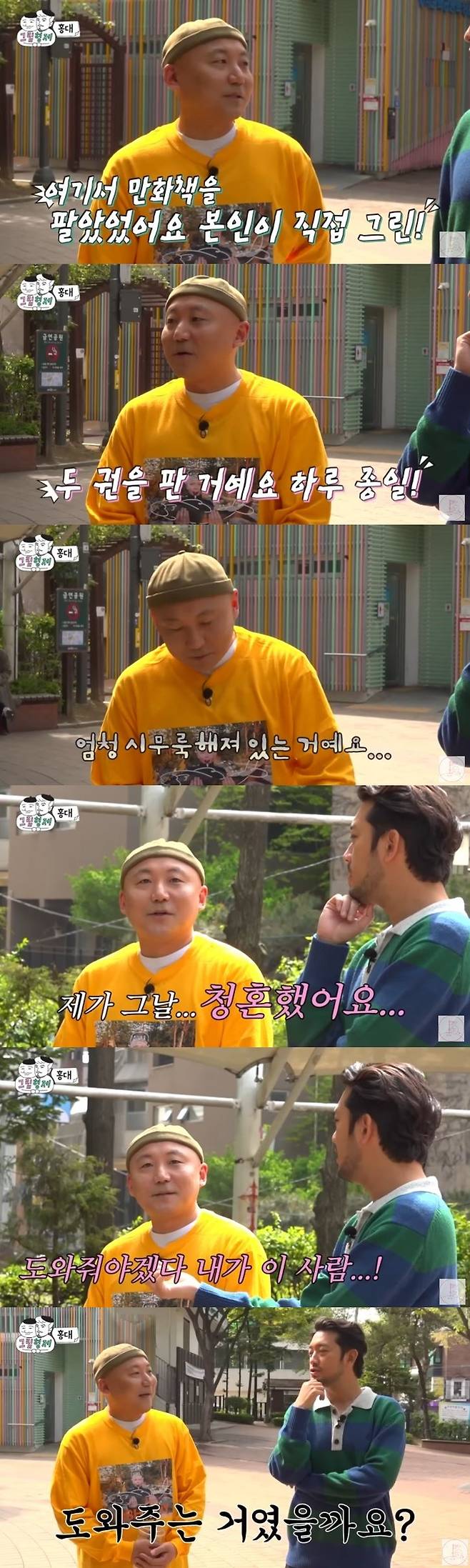 이날 주호민과 이말년은 홍익문화공원을 찾아 대화했다. 주호민은 "여기 원래 놀이터 아니었나. 나 여기 기억난다. 여기서 플리마켓 같은 거 열린다. 아내가 15년 전에 여기서 본인이 직접 그린 만화책을 팔았다"라고 입을 열었다.