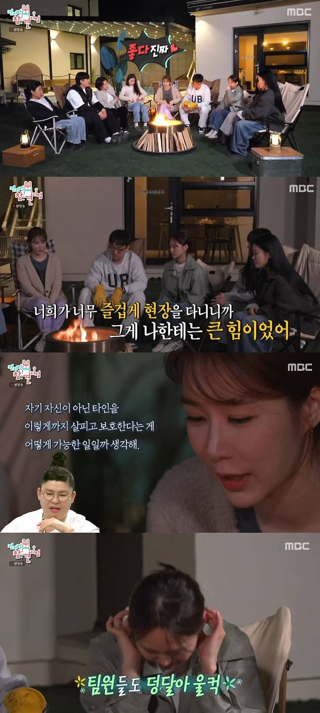 저녁 식사를 끝낸 뒤에는 캠프 파이어 시간이 진행됐다. 한 스태프가 그동안 말하지 못한 속내를 털어놓자 폭풍 눈물을 흘렸다. 매니저들의 진심어린 이야기를 전해 들은 유인나는 집에서 직접 써온 편지를 읽었다.