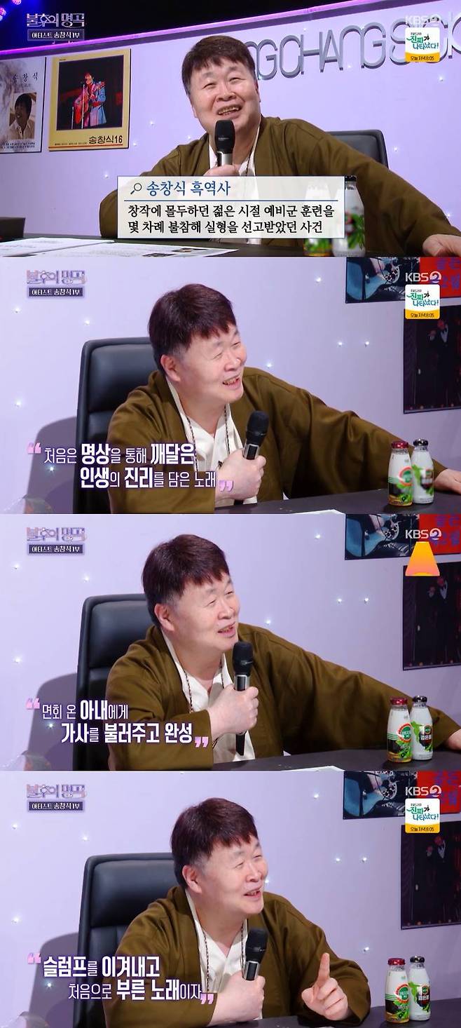 이어 송창식은 '사랑이야'라는 노래의 놀라운 비화를 밝혔다. 송창식은 "이 노래는 가사를 내가 감옥에 있을 때 썼다"며 예비군 훈련을 몇 차례 불참해서 감옥에 갇혀있을 때 명상을 통해 깨달은 인생의 진리를 가사로 썼고, 결혼 직전 면회 온 아내에게 가사를 불러줘 정리를 부탁하며 완성된 곡이라고 전했다. 또 성대 수술로 한동안 노래를 부르지 못하다가 겪은 슬럼프 후 처음으로 부른 노래이기도 하다며 '사랑이야'에 대한 각별한 애정을 보였다.