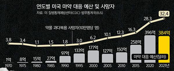 미국 정부는 오랫동안 마약 단속을 강화하고 처벌 수위를 높이는 것으로 마약 사용을 억제하려 했다. 1981년 출범한 로널드 레이건 행정부가 중독 치료보다 형사 처벌에 중점을 두면서 이런 전통이 시작됐다. 백악관 국가마약통제정책국(ONDCP)에 따르면 1970년대 마약 예산의 57∼58%가 치료·예방에 투자됐는데, 이것이 레이건 행정부 첫해 28%로 삭감되면서 20년 동안 30% 언저리를 맴돌았다. 대신 역사상 가장 많은 수의 반(反)마약법이 국회를 통과했는데, 일례로 1986년 레이건 대통령이 서명한 ‘약물남용 방지법’은 크랙 코카인을 5g만 소지하고 있어도 가석방 없이 최소 5년형을 선고하도록 의무화했다. 크랙은 코카인에 베이킹소다를 섞어 만든 저렴한 흡연용 마약이다.
