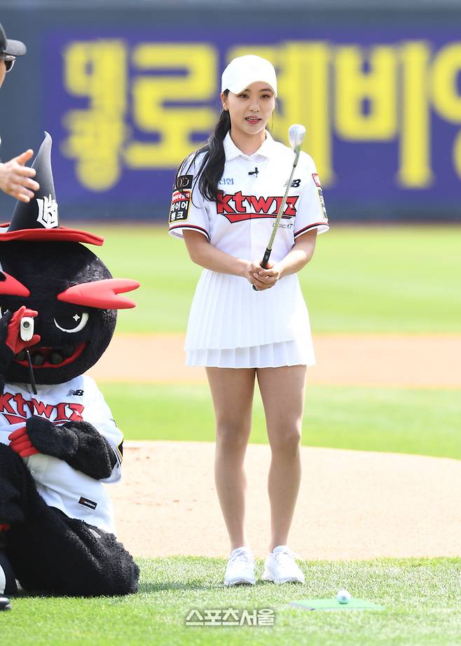 미스코리아 출신 프로골퍼 김솔비가 30일 수원 KT위즈파크에서 열린 2023 KBO리그 KT 위즈와 삼성 라이온즈의 경기에 앞서 골프 샷으로 시구를 하고 있다. 2023. 4. 30.