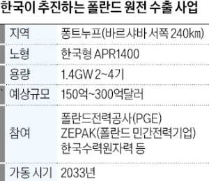 폴란드 정부는 자국에서 짓기로 한 원전 중 6기를 미국에 발주하고, 이와 별도로 2~4기의 추가 원전 건설을 한국에 맡기는 방안을 추진하고 있다. 한국수력원자력은 지난해 10월 폴란드전력공사(PGE)와 협력의향서(LOI)까지 체결했다. 한국이 맡게 될 폴란드 원전사업 규모는 최대 300억달러(약 40조원)에 달할 것으로 전망된다.