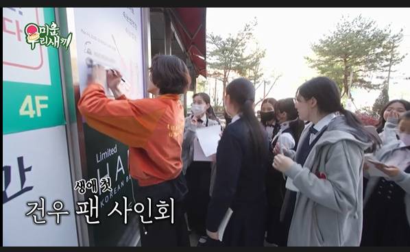이어 경쾌한 걸음으로 집을 나선 손명오가 그려졌다. 마스크없이 버스를 기다리는 모습. 버스에서도 사진요청이 쇄도했다. 길거리에서도 팬들은 "손명오씨"라며 그의 '더 글로리' 역의 이름을 부르며 반겼다. 거리에서 수많은 팬들을 마주쳤다. 특히 수줍어하는 소녀팬들은 "진짜 잘생겼다"며 감탄, 김건오는 "사진 찍어드리겠다"며 살갑게 다가가더니 사인까지 팬서비스를 잊지않았다. 소녀들은 김건우 뒤를 조르르 따라오기도 했다.