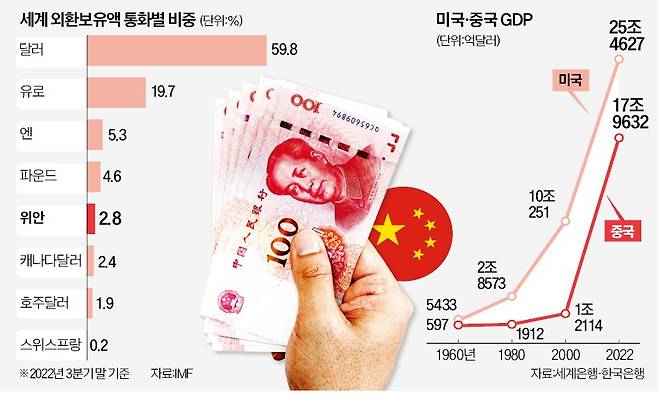 미국의 국력이 과거만큼 압도적이지는 않지만 위안화가 달러를 제치고 기축통화가 될 것이라고 보기엔 섣부른 면이 있다. 위안화의 국제적 위상이 아직은 초라하기 때문이다. 세계 외환보유액에서 위안화가 차지하는 비중은 3%가 채 안 된다. 세계 외환 거래액에서 위안화 비중은 3~4% 수준이다. 달러는 90% 가까이 된다.