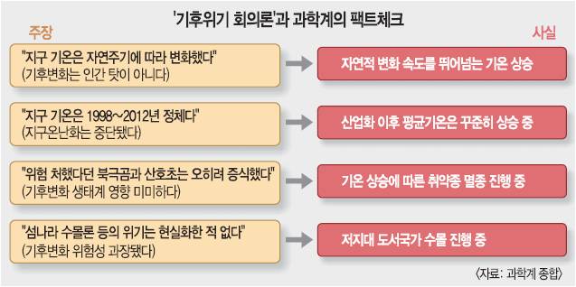 회의론자들은 기후위기 경각심을 위해 언급되던 사실들의 부분적 변화를 공격하기도 한다. “위협받는다던 북극곰 개체 수가 정작 1950년대 이후 늘었다”는 주장이 대표적이다. 하지만 이는 북극곰 사냥 금지 등의 보호조치 영향을 간과한 주장이다. 진경 극지연구소 빙하환경연구본부 책임연구원은 “북극곰은 애초 기후위기의 ‘대표 주자’로 홍보돼 보호가 빨리 이뤄졌다”고 했다. 그는 “수많은 멸종위기종 존재가 검증된 상황에서 한 특정 종을 근거로 전체 기후위기를 부정하는 건 이치에 맞지 않는다”고 말했다.