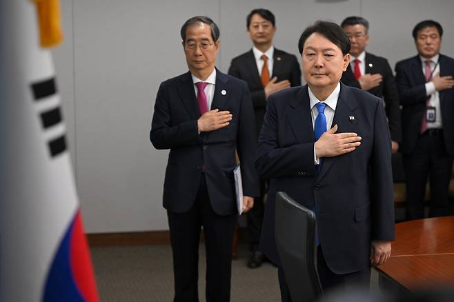 | ▲ 윤석열 대통령이 4월 18일 용산 대통령실 청사에서 열린 제16회 국무회의에서 국기에 대한 경례를 하고 있다. |
